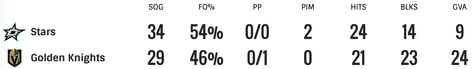 Ty Dellandrea scored to give the Stars the lead. A few minutes later he scored again to put the Stars up by two. The final score was 4-2 Stars. The Vegas Golden Knights now have a 3-2 series lead.