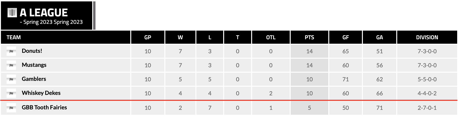 In the A-League, the Doughboy’s Donuts!, the Mustangs, and the Whiskey Dekes have secured playoff spots. The GBB Tooth Fairies have been eliminated from playoff contention.