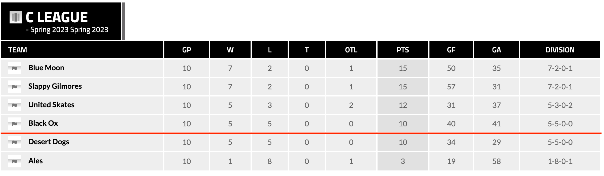 In the C-League, the Slappy Gilmores, Blue Moon, United Skates, and Black Ox have secured a playoff spots. The Pale Ales and the Desert Dogs have been eliminated from playoff contention.