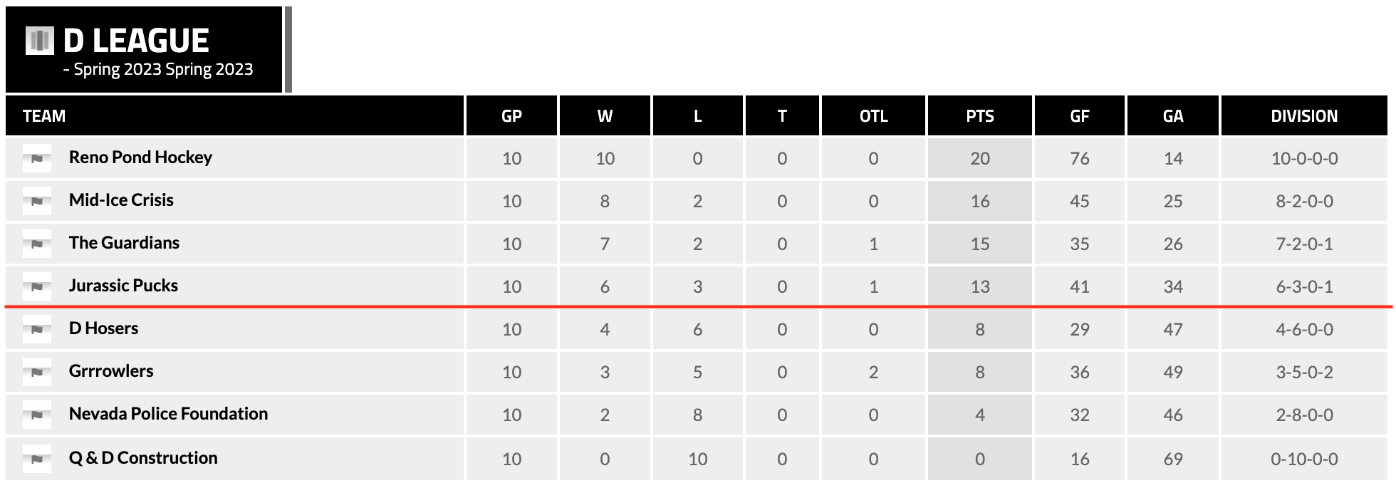 Secured playoff spot: Reno Pond Hockey, The Guardians, Mid-Ice Crisis, Jurassic Pucks