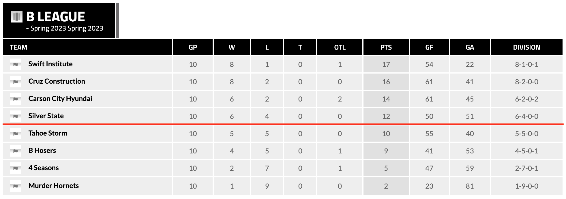 In the B-League, the Swift Institute, Cruz Construction, Silver State Wire, and Carson City Hyundai have secured playoff spots. In the B-League, 4 Seasons, the Murder Hornets, the Tahoe Storm, and the Reno Fire Hosers B have been have been eliminated from playoff contention. The B-League regular season is now over.