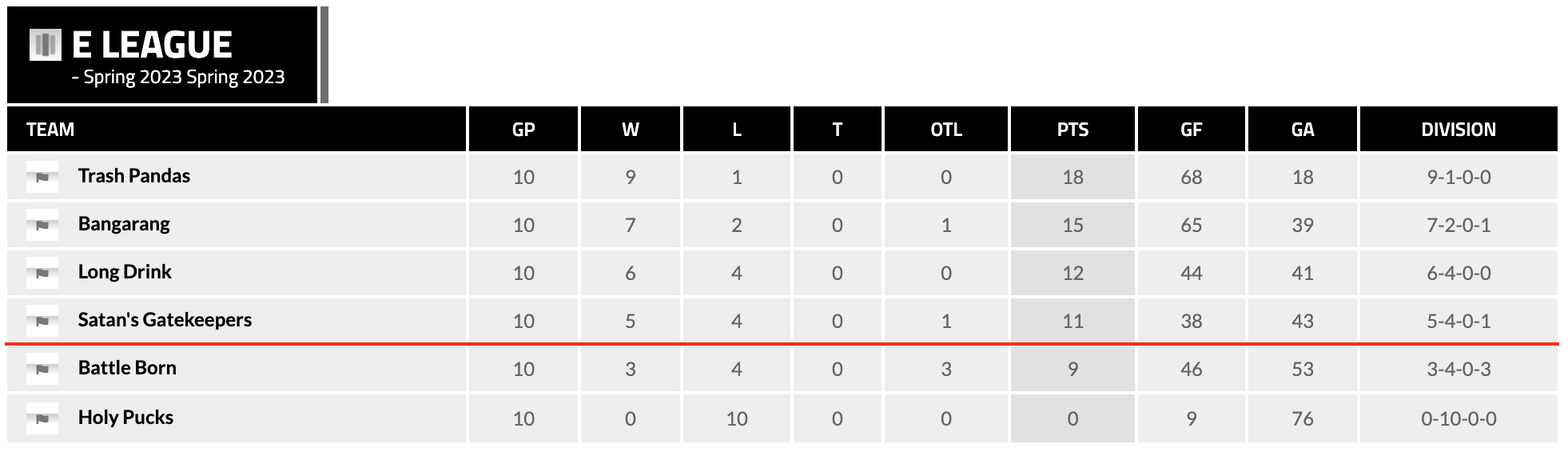 In the E-League, Bangarang, the Trash Pandas, Long Drink, and Satan’s Gatekeepers secured playoff spots. The Holy Pucks, and Battle Born have been eliminated from playoff contention. In the E-League there is one game remaining.