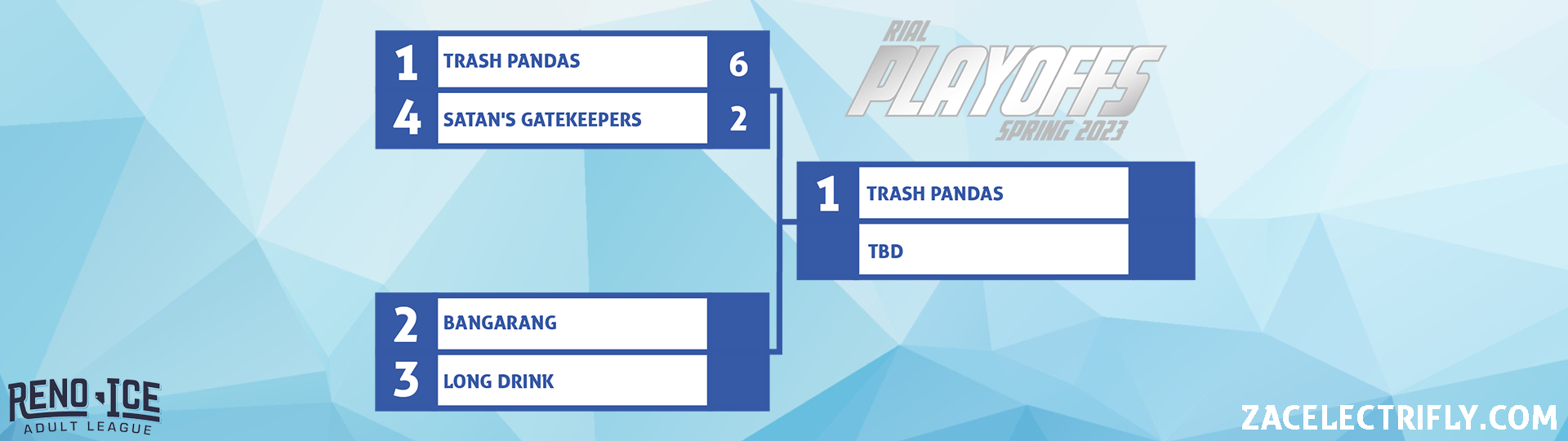 The Trash Pandas won the Reno Ice Adult League Spring 2023 E-League regular season title. They won the title with a record of 9-1-0 and 18 points. This is their second regular season title. They have now won back to back regular season titles. Their last regular season title was the RIAL Fall 2022 regular season title. The Trash Pandas have appeared in both of the prevues E-League Championship games but have not won either.
