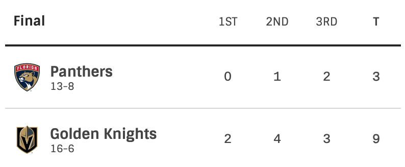 The Vegas Golden Knights have won the Stanley Cup. The Florida Panthers have been eliminated from the playoffs in the Stanley Cup Finals.