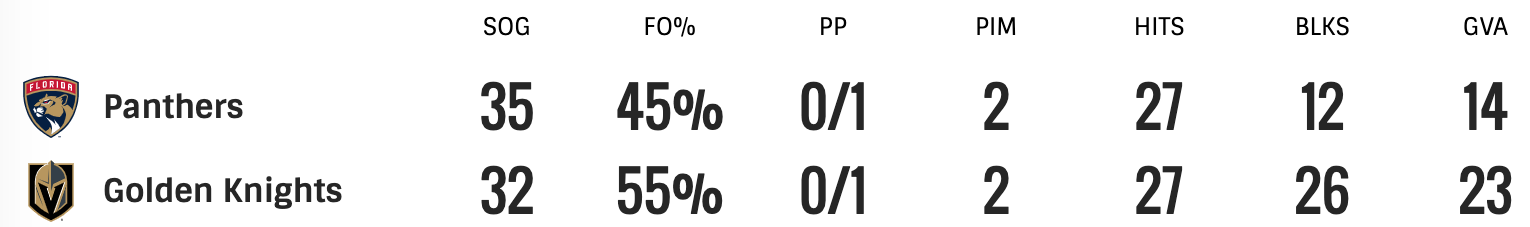 Going into game five of the Stanley Cup Finals the Vegas Golden Knights had a 3-1 series lead over the Florida Panthers after winning game one 5-2, game two 7-2, and game four 3-2. The Panthers won game three 3-2 in overtime. Game five started off with Golden Knights short handed goal. Mark Stone scored the opening goal. Nicolas Hague scored to add to the Golden Knights lead. The score was 2-0 Golden Knights after the the first period.