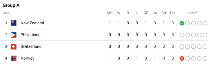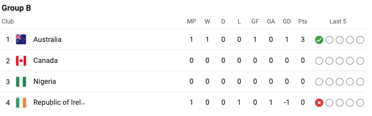 Most teams have not played yet. New Zealand leads Group A. Norway are now in last in Group A. Australia now leads Group B. The Republic of Ireland are now at the bottom of Group B