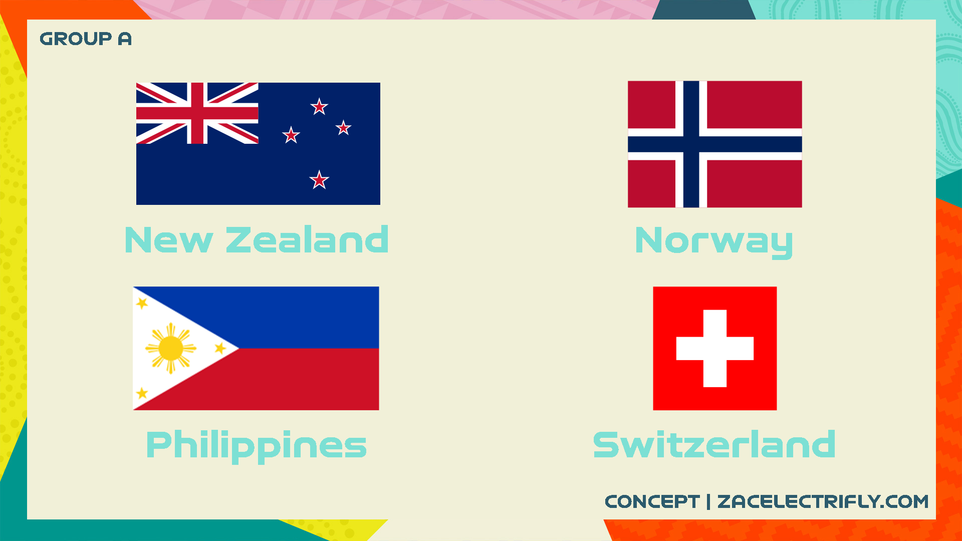 Here is what Group A looks like. The red Switzerland jerseys are my favorite. #1 ranked is Switzerland. #2 ranked is New Zealand. #3 ranked is the Philippines. #4 ranked is Norway.