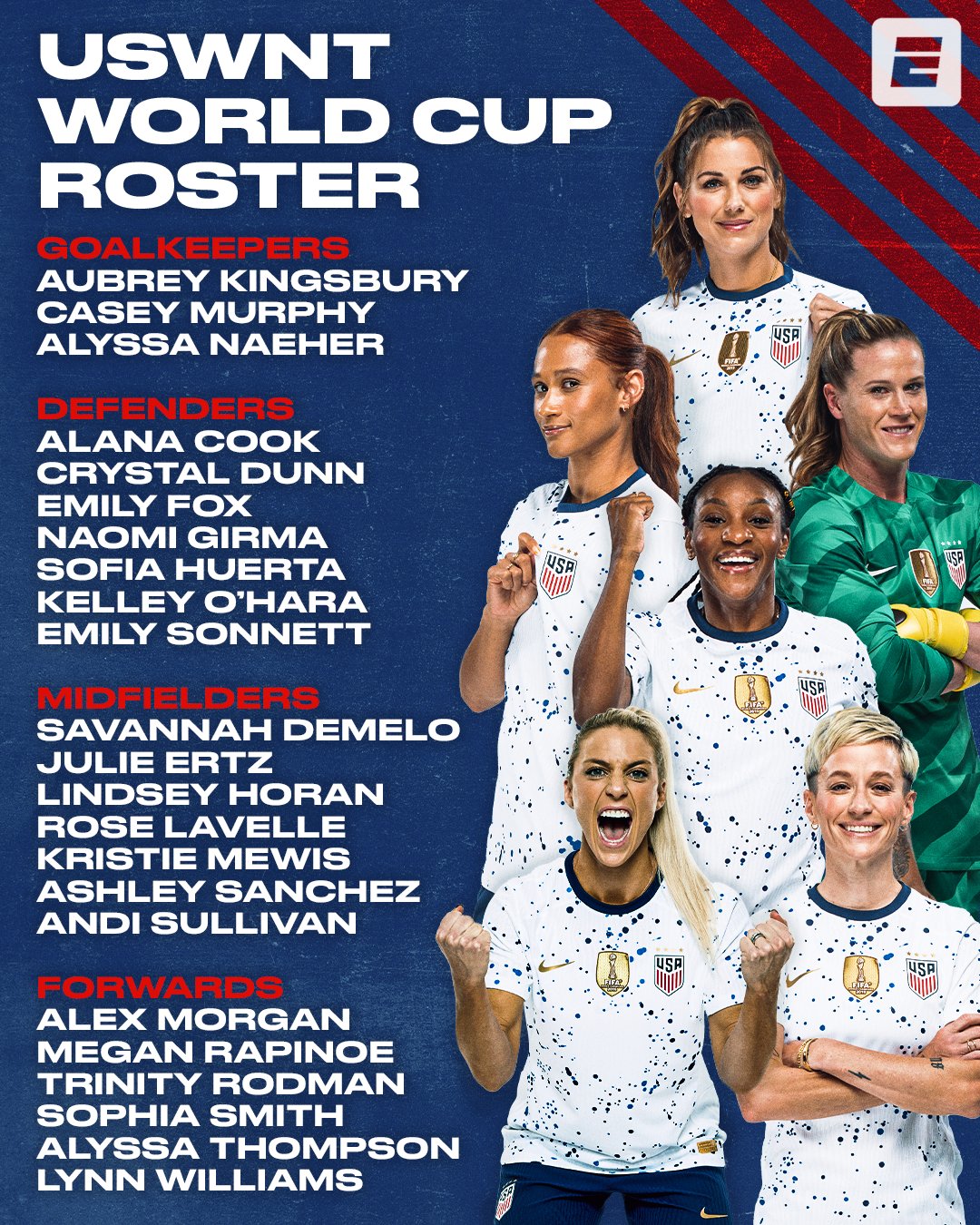 Alyssa Naeher is the the goal keeper for the United States. She has ninety one caps with the team. She has a lot of experience. She has been playing with the United States Women’s National Team since 2014 and prior to that she played with the under twenty team. She has had an amazing career but at the age of thirty five this could be her last FIFA Women’s World Cup. The other big player on the roster is Alex Morgan. With over two hundred caps for the United States Women’s National Team she has been a key player for the team for a long time. She will probably be a key player in this years tournament. The rest of the team is made up of a lot of core players that have been with the team for a while now.