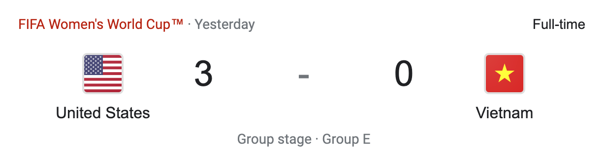 The United States played Vietnam. Check out my post game review for this match if you have not yet. The United States scored in the 14′ minute and 45+7′ minute to take a 2-0 lead into halftime. They then scored in the 77″ minute to make it 3-0. The final score was 3-0. Sophia Smith and Lindsey Horan scored the goal for the United States.