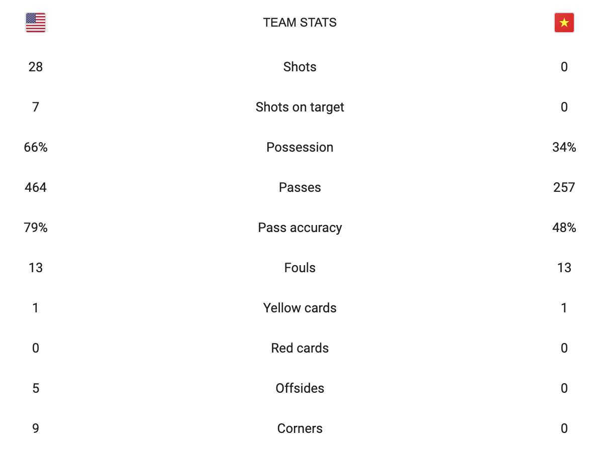 The United States dominated the game. Unfortunately they were unable to finish more of their shots. Shots were going wide, hitting posts, and being blocked. If the United States was a little bit tighter on finishing they would have scored like seven goals. Vietnam played like they lost the game before it even started. To prove the United States dominated this match Vietnam didn’t have a single shot in the game.