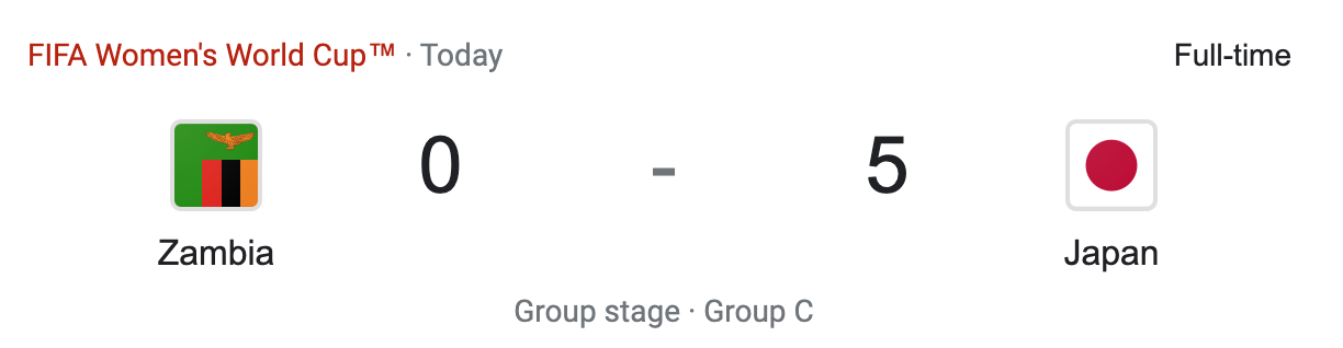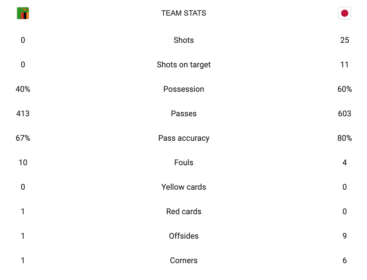Japan absolutely dominated this game. This is how I thought the United States game would go. Japan were the heavy favorites going into this match and they did not disappoint. Zambia had zero shots. There was nothing Zambia could really do. From what I watched Japan was just in control. Zambia could’t get the ball out of their own half and it was chance after chance for Japan. Zambia didn’t even have any good possession. They would take the ball up and give it away almost every time Japan challenged for it. It was a disappointing showing from Zambia but in the end it was not surprising.