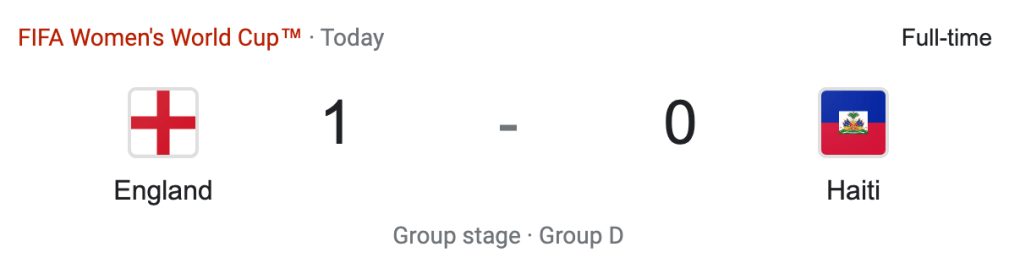 England played Haiti. It was a Group D match up. The game started off with a penalty that was called off after VAR (review) in the 17′ minute. Haiti then got a yellow card in the 19′ minute. England was awarded a penalty after VAR (review) in the 26′ minute. In the 29″ England would score the games only goal on penalty. #8 Georgia Stanway scored the goal. England was awarded a yellow card just before halftime. England got another yellow card just after halftime. the Final score was 1-0 England.