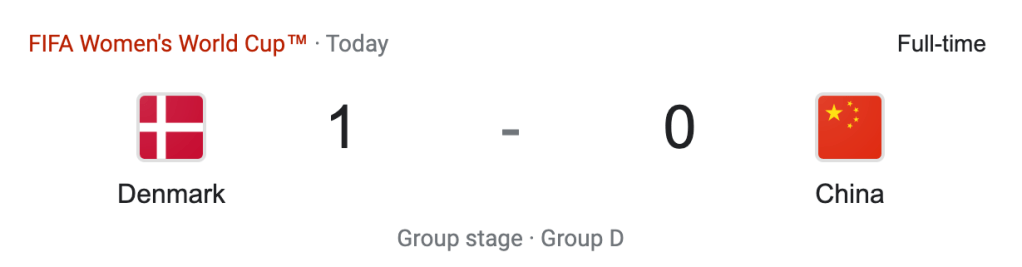 Denmark played China. It was a Group D match. Denmark were awarded a yellow card in the 40′ minute. The score was 0-0 going after the first half. Denmark finally scored the games only goal in the 89′ minute. #9 Amalie Vangsgaard scored the goal. Denmark would hang on to win 1-0.
