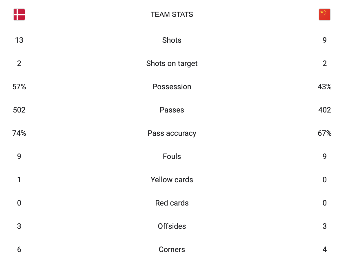 This was a close game. I thought this game would be tight. This game could end up being the decided between Denmark and China to see who makes it out of the group stage. Overall it was a back and fourth game with both teams getting plenty of chances. Denmark just happened to get the endge on China.