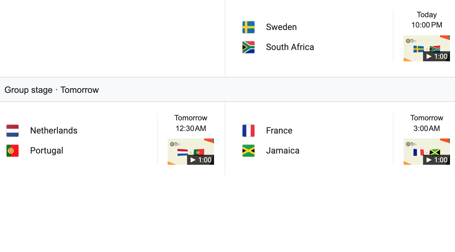 Sweden is playing south Africa. Sweden should win that one but I don’t think it will be a blowout. The Netherlands play Portugal. That should be a close game with the Netherlands have a slight advantage and winning it. France will play Jamaica. I think France will win that one and that could end up being another one sided match.