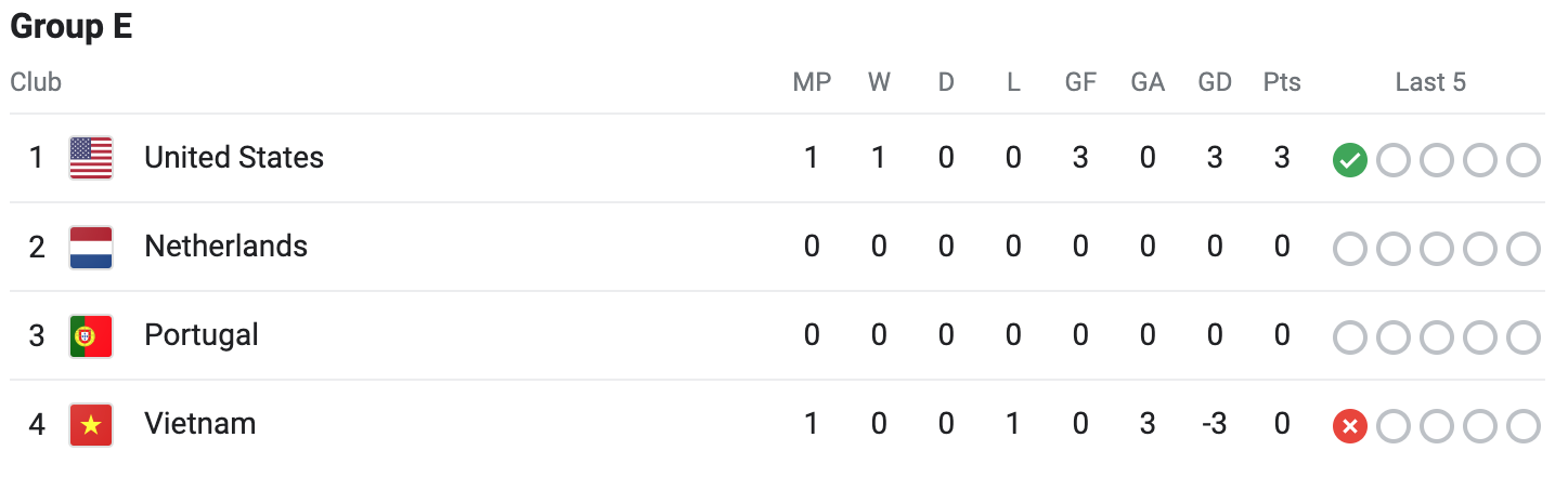 Japan now lead Group C. Zambia is now in the back of Group C. Denmark now lead Group D. Haiti are in last in that group. The United States now lead Group E. Vietnam are last in that group now. Group F, Group G, and Group H have not played yet.