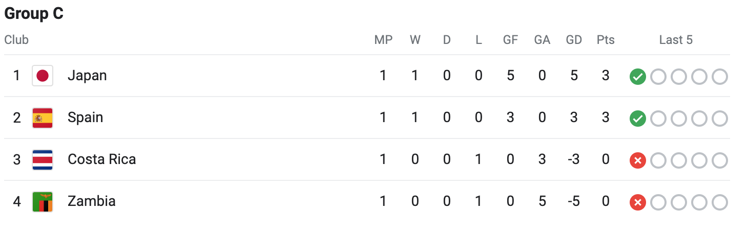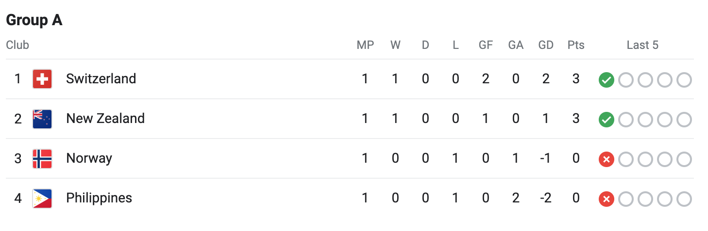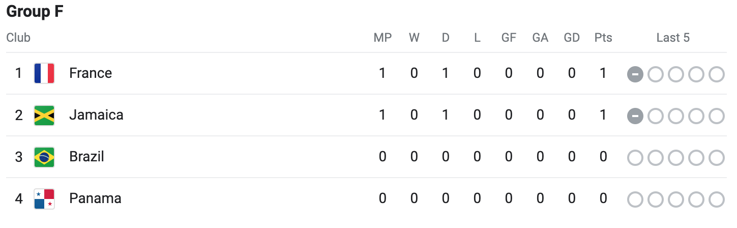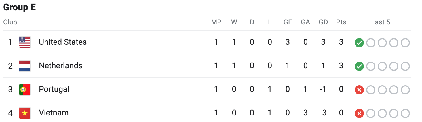The United States still lead Group E with Vietnam still in the back. The Netherlands are in a position to advance with Portugal in an elimination position. France now lead Group F with Panama now last in that group. Sweden now leads Group G. With South Africa now in last in that group. Group H has still not played a game.