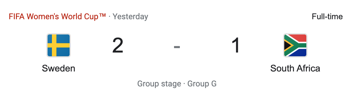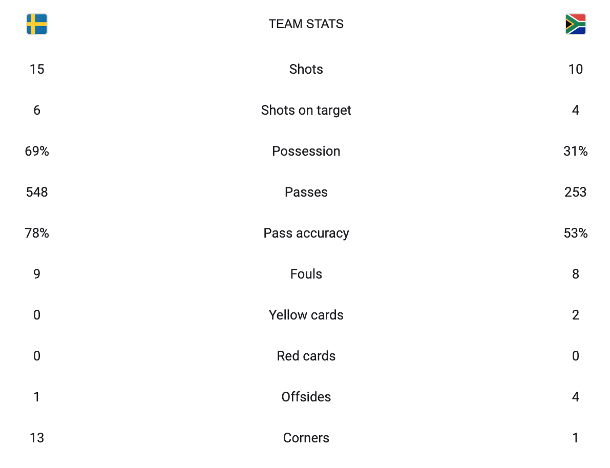It was a closer game than I thought it might have been. I think it was huge that South Africa scored the opening goal and had the lead over Sweden. In the end Sweden proved to be too much for South Africa. It was a close game despite Sweden controlling possession with a thrilling ending.