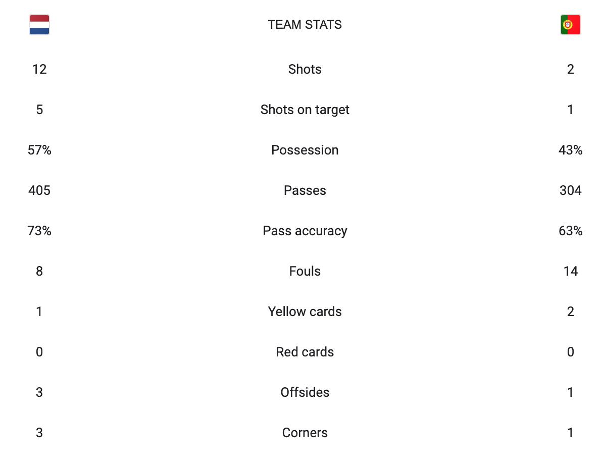 It was another match with a close scoreline. The Netherlands had plenty of chances that they could not convert. Portugal only had a couple of chances. Despite that Portugal kept it close limiting the Netherlands to one goal. It was a solid match. This match will probably be the decider in Portugal moving past the Group Stage.