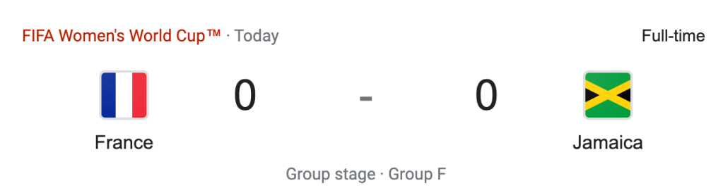 France played Jamaica. It was a Group F match up. The game started with France getting a yellow card in the 14′ minute. Jamaica got a yellow card in the 24′ minute. They got another yellow card in the 37′ minute. The first half would end with neither team scoring and the game tied at 0-0. Jamaica got a red card in the 90+2′ minute after #11 Khadika Shaw got her second yellow card. The Match would end scoreless. This is the first scoreless match of the tournament.