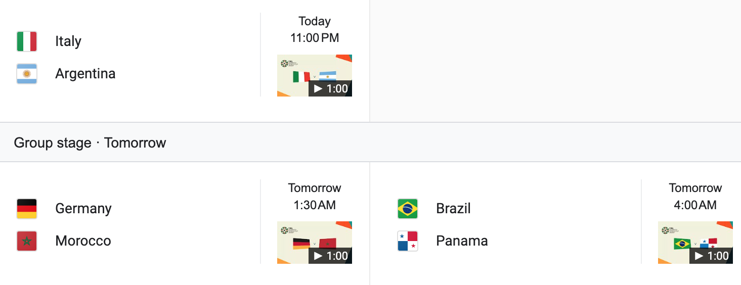 Italy is playing Argentina. That should be a good match. Germany is playing Morocco. Germany should dominate that game. Brazil is playing Panama. Brazil should easily win that game.