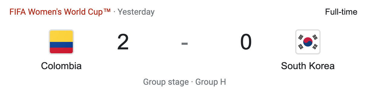 Colombia played the Republic of Korea. It was a Group H match. The game started off with a yellow card for Colombia in the 10′ minute. The Republic of Korea got a yellow card in the 29′ minute. Colombia scored the first goal of the game in the 30′ minute. The goal was scored by #11 Catalina Usme. The goal was scored on a penalty kick after the Republic of Korea player blocked the ball with her arm. in the 39′ minute Colombia added to their lead. #18 Linda Caicedo scored to put Colombia up by two goals. She came down the wing with the ball. She cut in towards center and took a shot. Her shot was too much for the keeper to handle. The keeper blocked the ball but it went in behind her. Colombia got another yellow card in the 45+6′ minute. The Republic of Korea got a yellow card in the 45+7′ minute. The score was 2-0 Colombia at half time. Colombia would hold on to their two goal lead. The final score as 2-0 Colombia.