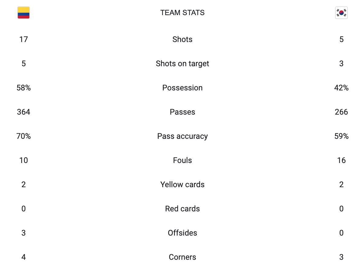 This game was a solid showing from Colombia. They showed they can finish. The Republic of Korea unfortunately had that penalty called against them. Then their keeper let them down by not saving the second goal. The Republic of Korea were their own worst enemies in this game. Colombia scored one and kept the pressure on them. The second goal put the game away. It ended up being a good game.