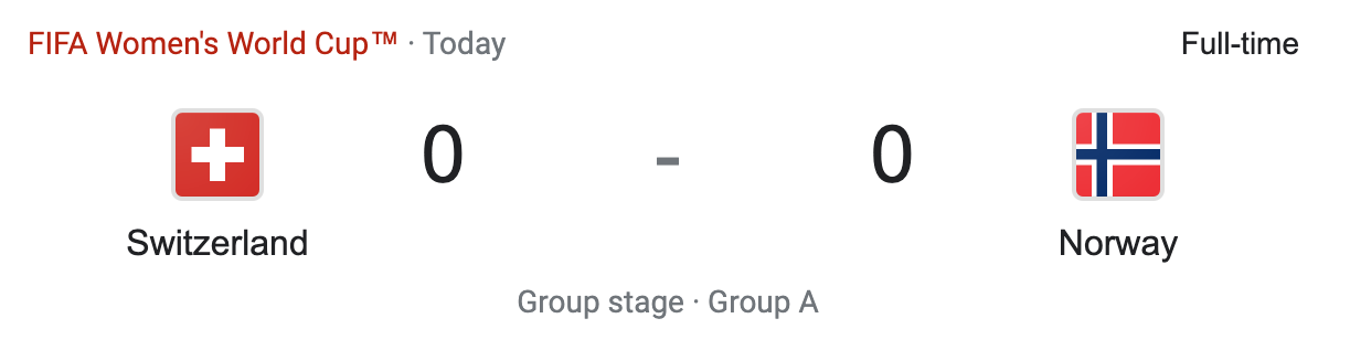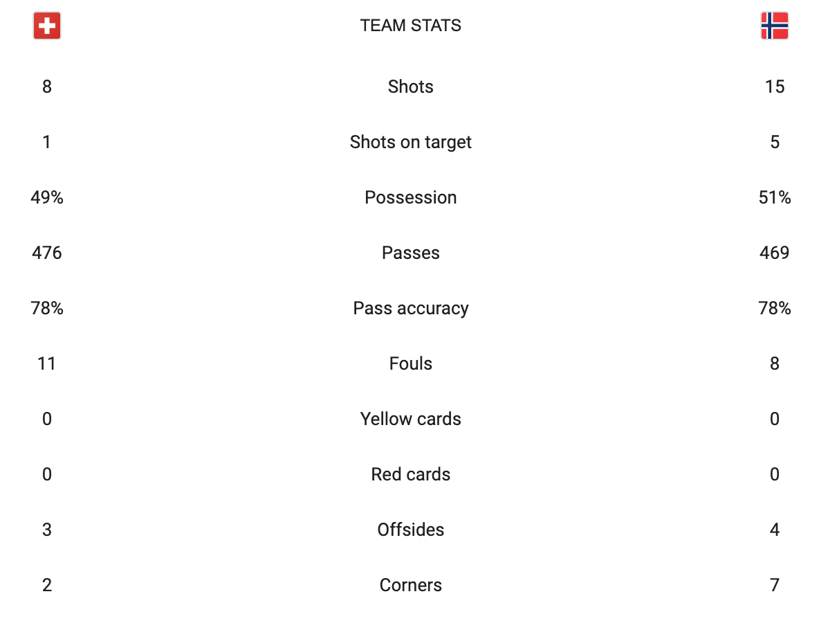 Switzerland played Norway. It was a Group A match. Norway needed at least a draw to stay alive in the competition. Nothing happened in the first half. The score was still tied at 0-0. Neither team would score in the second half. The game ended in a 0-0 draw.