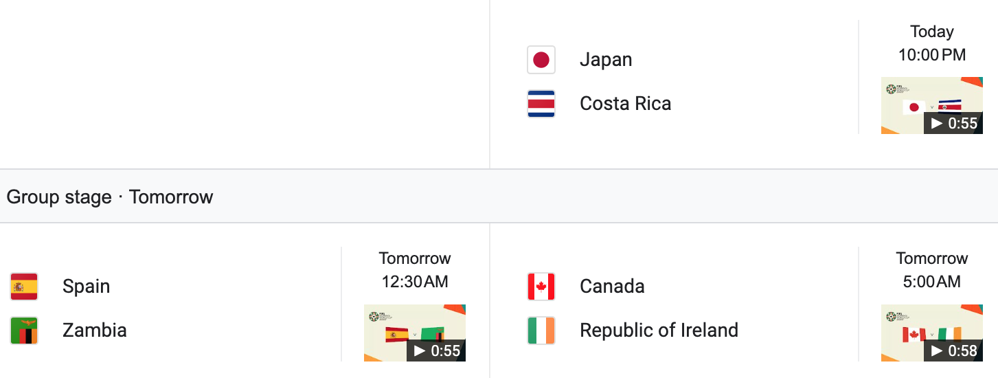 Japan is playing Costa Rica. That should be a good game. Costa Rica needs at least a draw to avoid elimination. Spain is playing Zambia. Spain should dominate that game. Zambia do not at least get a daw they will be eliminated. Canada is playing the Republic of Ireland. That should be a good game. I think Canada will win that game. The Republic of Ireland need a draw to keep their hopes of advancing alive.