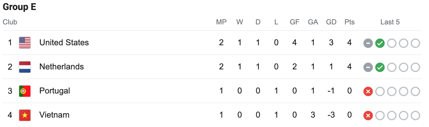The United States is still on top of Group E. The United States still has a chance of not making it out of the group stage. Both Portugal and Vietnam could still end up with up to six points. Based on the results of that game later tonight the United States might have to win their final group game to advance.