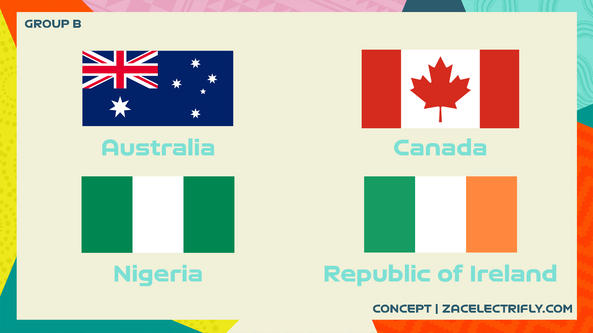 Here is what Group B looks like. The red Canada jerseys are my favorite. #1 ranked is Canada. #2 ranked is Ireland. #3 ranked is the Republic of Ireland. #4 ranked is Australia.