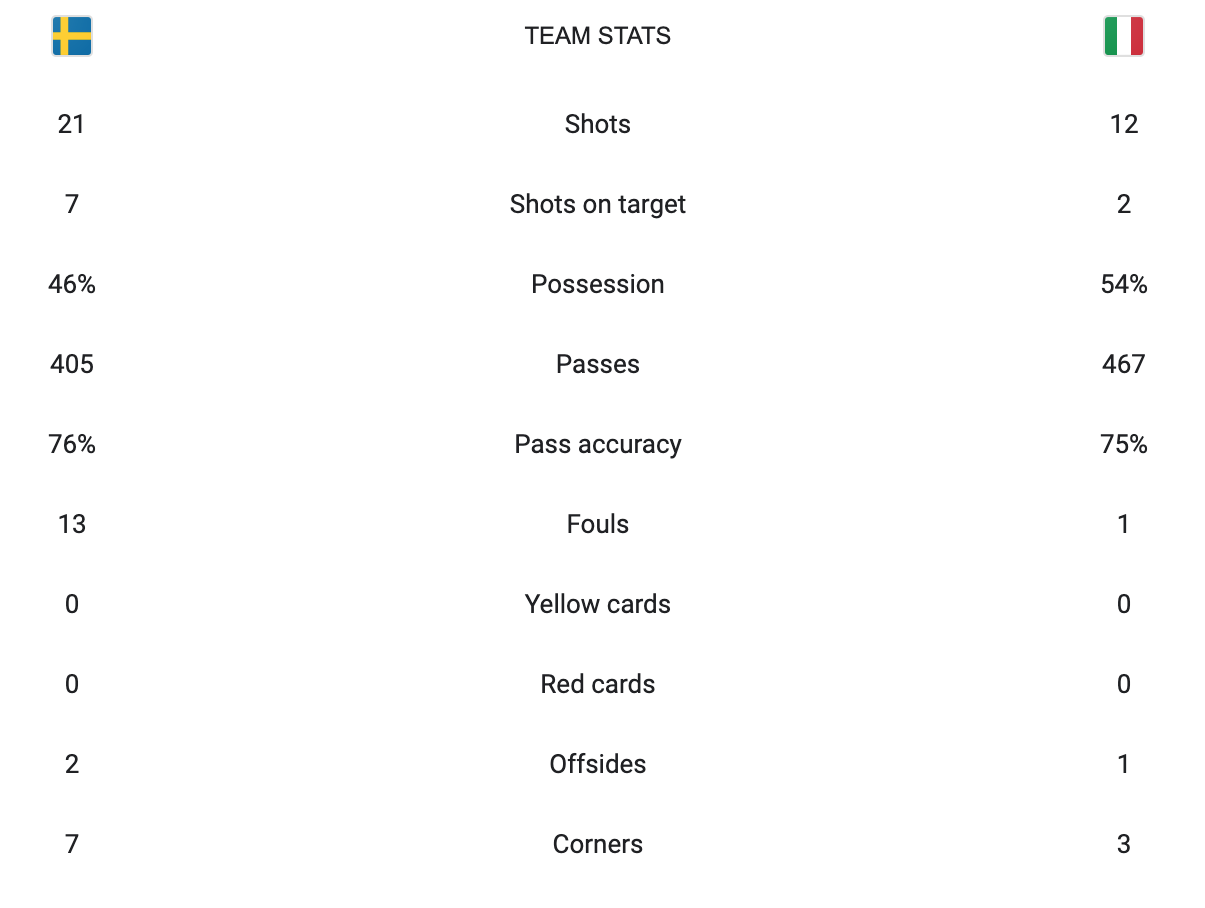 This game was another brutal blowout. Italy will probably still recover and end up in the Round of 16 but still this was not a good showing for them. The third goal put the game away. The game was out of reach for Italy before they even took the field for the second half. Sweden was brutally efficient on their corner kicks in this game. Italy just wasn’t there defensively and it showed. With that result Sweden will now be moving on to the Round of 16.