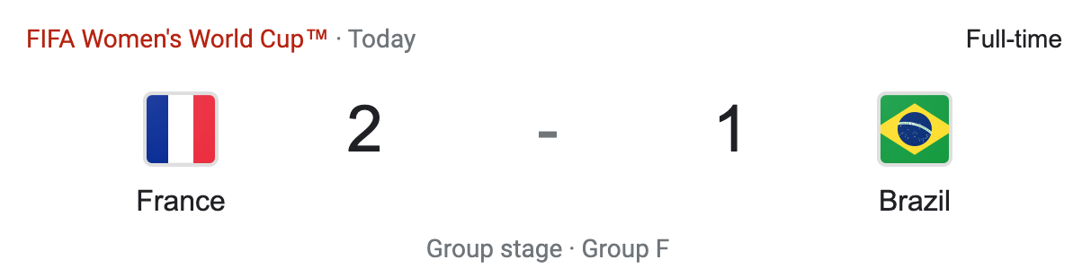 Panama played Jamaica, It was another Group F match. Panama got a yellow card in the 13′ minute. They got another yellow card in the 17′ minute. Jamaica got a yellow card in the 31′ minute. Neither team scored in the first half. The score was still 0-0 at halftime. Jamaica scored in the 56′ minute. #17 Allyson Swaby scored the goal. The goal was scored on a header from a corner kick from the right of the keeper. This was their second ever goal in the FIFA Women’s World Cup. It was also their first ever lead in the FIFA Women’s World Cup. In the 90+3′ minute a penalty kick was overturned after VAR (review). The final score was 1-0 Jamaica. With that result Jamaica won their first ever FIFA Women’s World Cup game.