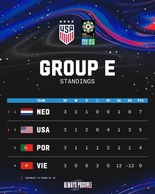 The Netherlands beat Vietnam 7-0. With that result they won Group E. The United States came in second so they will be advancing. Portugal is now eliminated. Vietnam was already eliminated. Vietnam also finish the FIFA Women’s World Cup 2023 having not scored a goal.