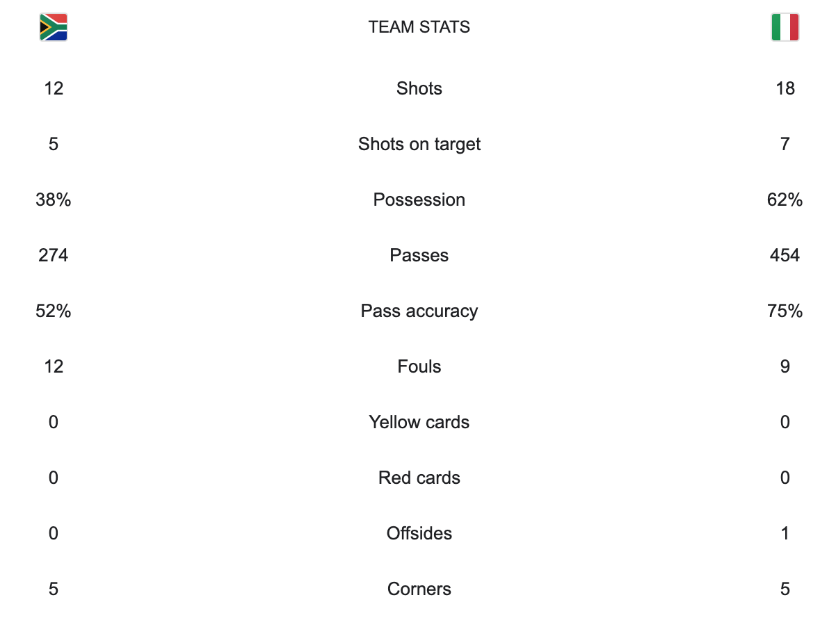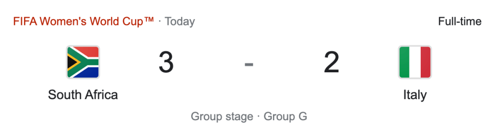 Italy became their own worst enemy here. The own goal made all the difference in the end. It was a very entertaining match with both sides trading leads. It had a very thrilling conclusion. With that result South Africa are advancing to the Round of 16. This was the first ever FIFA Women’s world Cup win for South Africa. This will also be the first time they are moving on to the Round of 16. Italy have been eliminated. They finished the tournament with one win and two losses.