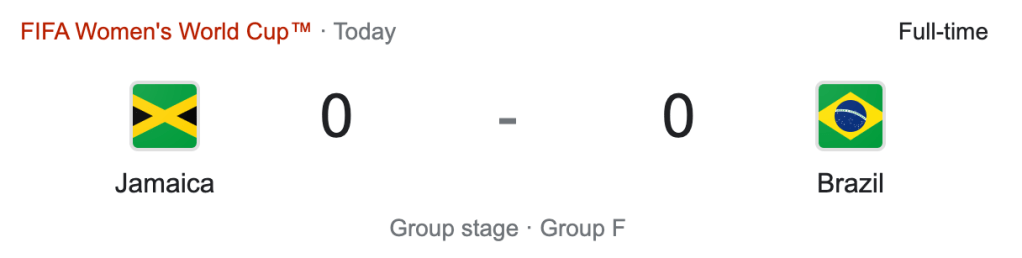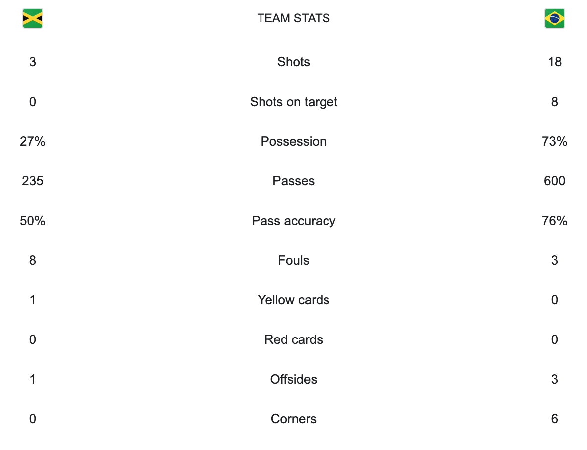 It was an uneventful game. It was not the way Brazil wanted to end their tournament. With this result Jamaica advance to the round of 16 for the first time ever. They finish the group stage undefeated after two draws and a win. Brazil have been eliminated in the group stage for the third time ever. This is the first time since 1995 that Brazil is not moving on past the group stage.