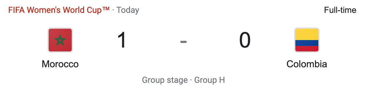Colombia has won Group H. Morocco came in second and will be advancing to the Round of 16. This is their first time in the FIFA Women’s World Cup so this will be the first time that they are advancing. Germany came in third and is eliminated. This is the first time ever that Germany has been eliminated in the group stage. Korea Republic came in last in the group.