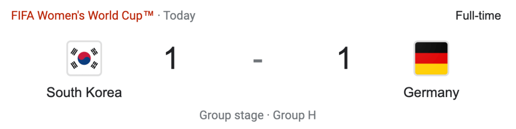 The Korea Republic scored early. They took the lead in the 6′ minute with a goal from #Cho So-hyun. She got the ball behind the German defense it what to me looked clearly offsides. She was able to beat the goalie one on one. Germany answered with a goal in the 42′ minute from #11 Alexandra Popp. The ball was crossed in and she headed it into the back of the net. The score was tied at 1-1 at halftime. In the 58′ minute A goal was called back from Germany after VAR (review). Germany got a yellow card in the 90+6′ minute. The final score was a 1-1 draw.