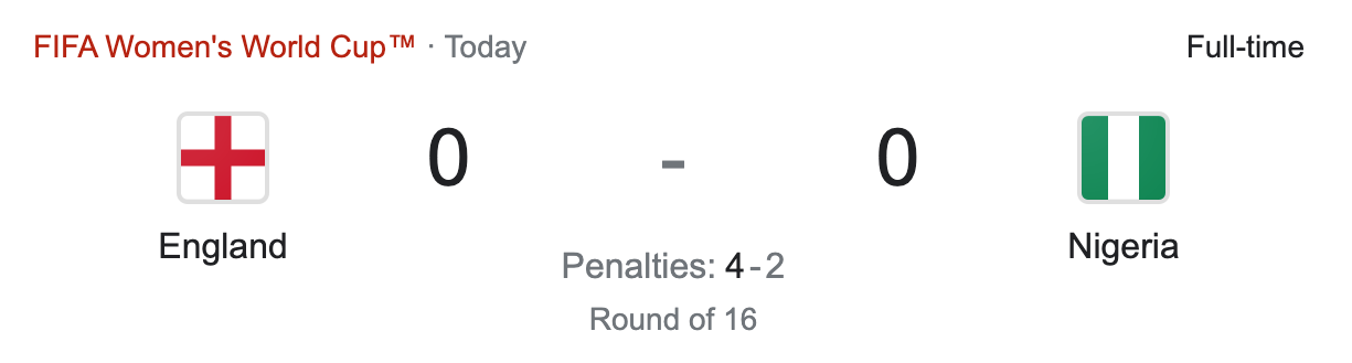 This was the second match in the Round of 16 to go to a penalty shootout. It was also the second game in a row where neither team scored. England moves on after a poor performance and a mostly uneventful game. They were outshot twenty to twelve by Nigeria. England barely had majority of the possession. It was a tightly contested game but not much happened either. With the result of this game England has advanced to the Quarterfinals for the fifth time ever. They will play Colombia or Jamaica. Nigeria has been eliminated.