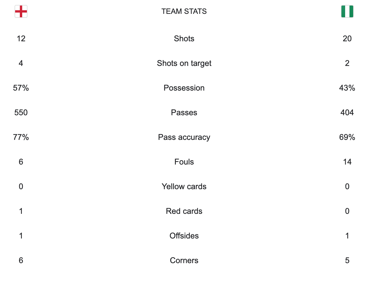 In the 33′ minute a penalty kick that was awarded o England was overturned. At halftime the score was 0-0. In the 84′ minute Englands #7 Lauren James got a yellow card for a foul. After VAR (review) she was given a red card for stomping on the Nigerian player. After 90+6′ minutes the game was still scoreless. It went into extra time. Nothing changed in extra time. The game went to a penalty shootout. England won the Penalty shootout 4-2. The final score was 0(4)-0(2) England.