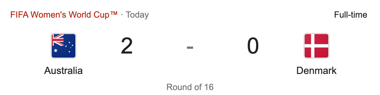 Australia took on Denmark. Australia won Group B. Denmark came in second in Group D. This was Australia’s third ever Round of 16 Match in the FIFA Women’s World Cup. In the FIFA Women’s World Cup 2019 they were eliminated in the Round of 16. Their best ever result was making it to the Quarterfinals which they did in 2007, 2011, and 2015. This was Denmarks third ever Round of 16 match in the FIFA Women’s World Cup. Denmark did not qualify for the FIFA Women’s World Cup 2019. They also did not qualify in 2011 or 2015, Their best result was reaching the Quarterfinals in 1991 and 1995.
