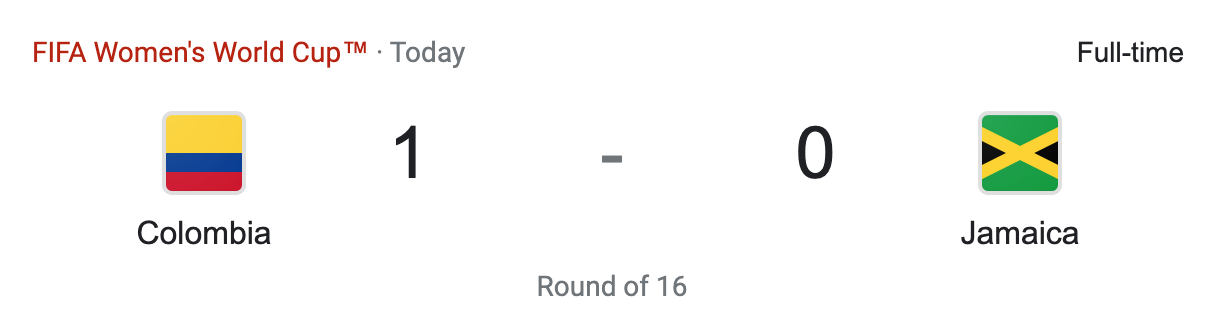 Colombia played Jamaica. Colombia won Group H. Jamaica came in second place in Group F. This was Colombias second ever Round of 16 match in the FIFA Women’s World Cup. They did not qualify for the FIFA Women’s World Cup 2019. Their best ever result was making it to the Round of 16 in 2015 and now 2023. This was Jamaicas first ever Round of 16 match in their second ever FIFA Women’s World Cup. They were eliminated in the group stage of the FIFA Women’s World Cup 2019. Their best ever result has been making it to the Round of 16 in this years FIFA Women’s World Cup.