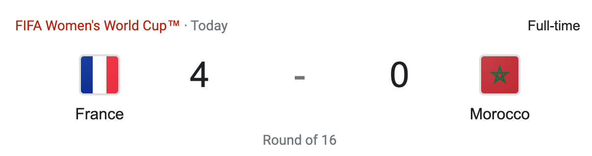 France won this game early on. The seven minute stretch where they scored three times really put the game out of the reach of Morocco. Morocco basically didn’t have a chance when they let France score at will for almost ten minutes. Morocco wasn’t challenging France inside their box. They were giving up the ball in their own box. They let France have all the time and space they wanted in their own box. In the end France outplayed Morocco and was playing on a whole different level. France had fifteen shots and seventy five percent of the possession and kept Morocco to a single shot. With that result France advances to the Quarterfinals. This is the fourth time and fourth time in a row that they have reached the Quarterfinals of the FIFA Women’s World Cup. They will play Australia in the Quarterfinals. Morocco has been eliminated.