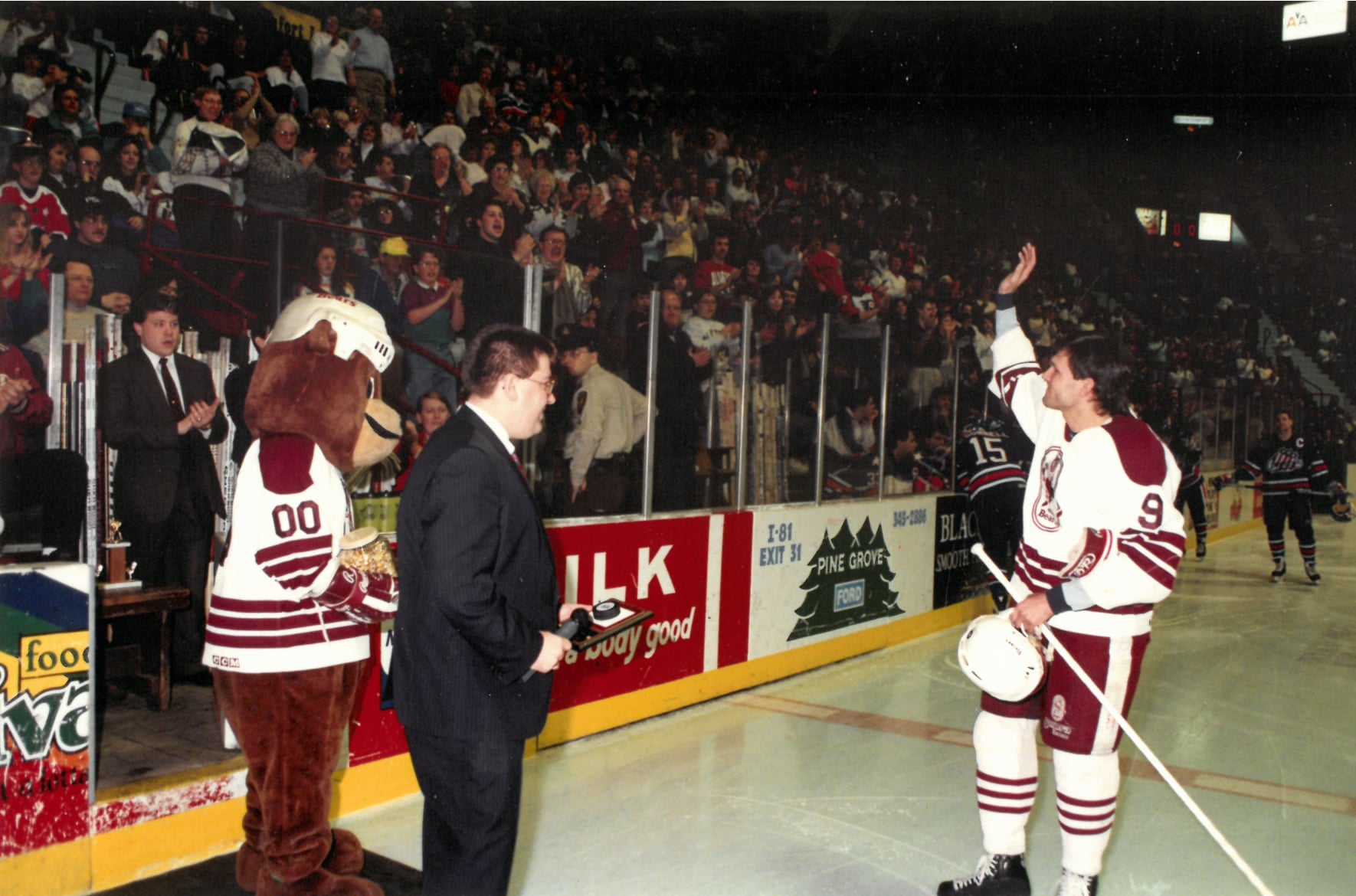 Tim Tookey’s professional hockey career lasted from the 1980-81 season to the 1994-95 season. He won the AHL Playoff MVP for the 1985-86 season. He won the AHL MVP for the 1986-87 season. He also won the award for most points in the AHL regular season in the 1986-87 season. He won the AHL sportsmanship award for the 1992-93 season. He was inducted into the AHL Hall of fame in 2008. The Hershey Bears have retired his number.