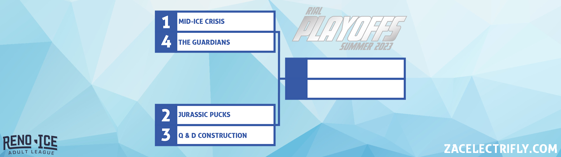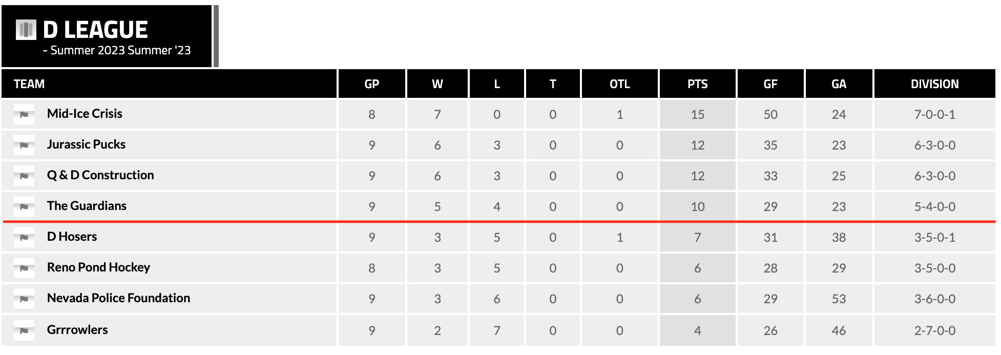 If the playoffs started today Mid-Ice Crisis would play The Guardians. The Jurassic Pucks would play Q & D Construction. The D-League playoffs start on Saturday, August 21st, 2023.