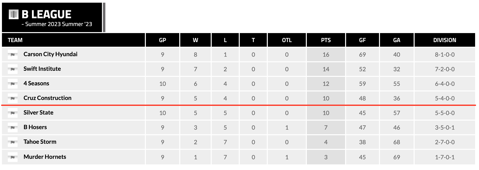 In the B-League, Carson City Hyundai, the Swift Institute, 4 Seasons, and Cruz Construction have secured playoff spots. Silver State Wire, the Reno Fire Hosers B, the Tahoe Storm, and the Murder Hornets have been eliminated from playoff contention. Teams in the B-League have up to one game remaining.