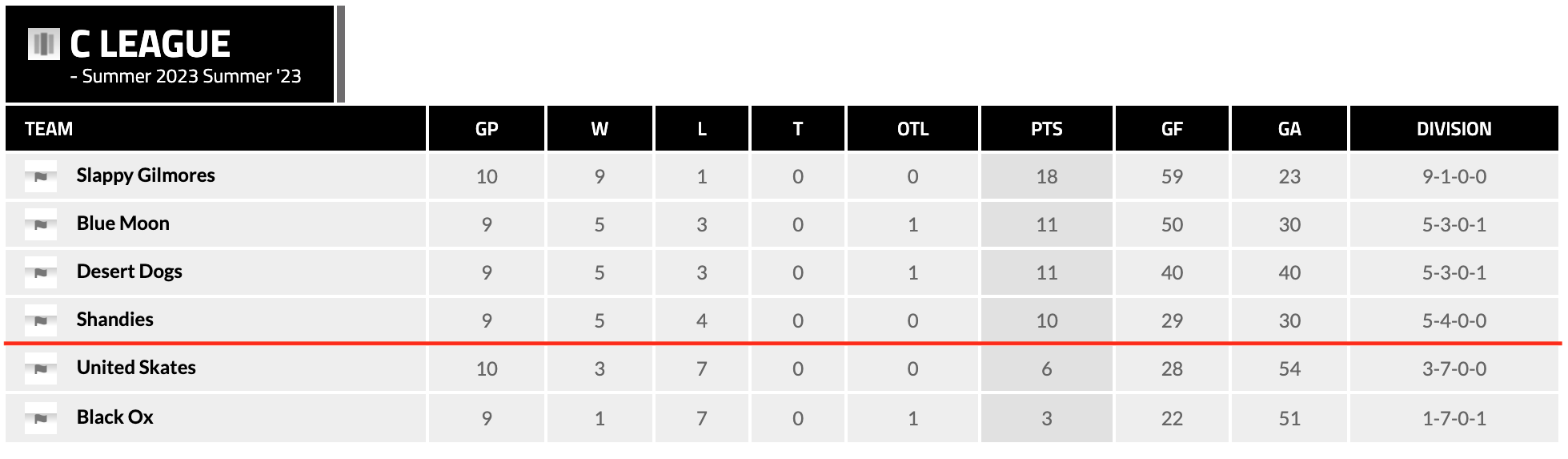 If the playoffs started today the Slappy Gilmores would play the Summer Shandies. Blue Moon would play the Desert Dogs. The C-League playoffs start on Friday, August 25th, 2023.
