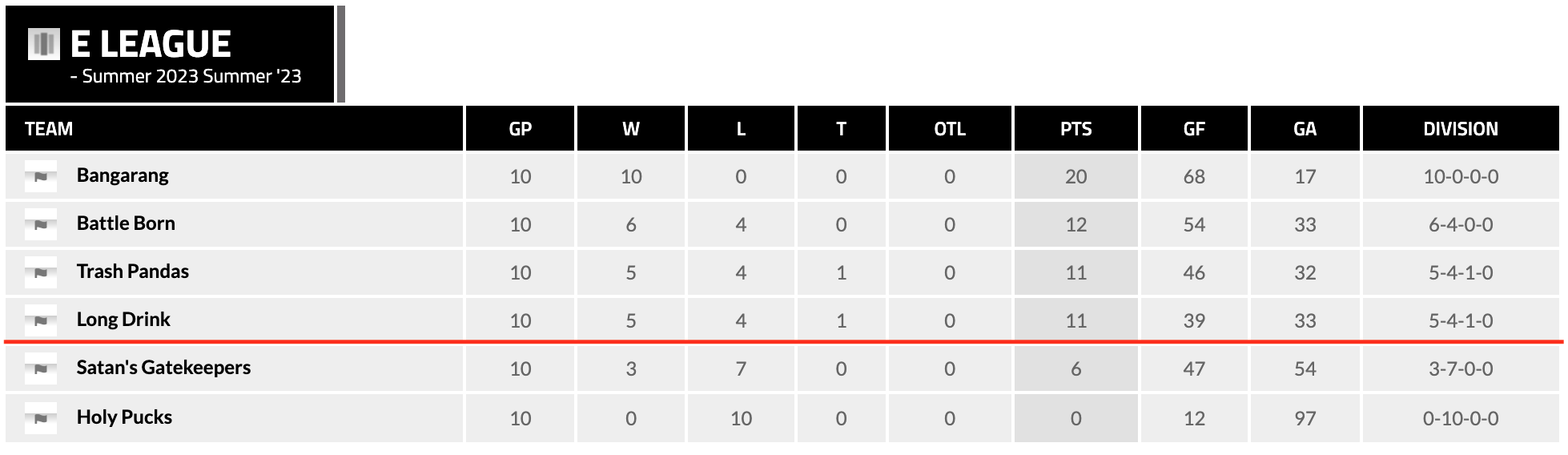 In the E-League, Bangarang, Battle Born, Trash Pandas, and Long Drink have secured playoff spots. Satan’s Gatekeepers and the Holy Pucks have been eliminated from playoff contention. The E-League has already finished the regular season.