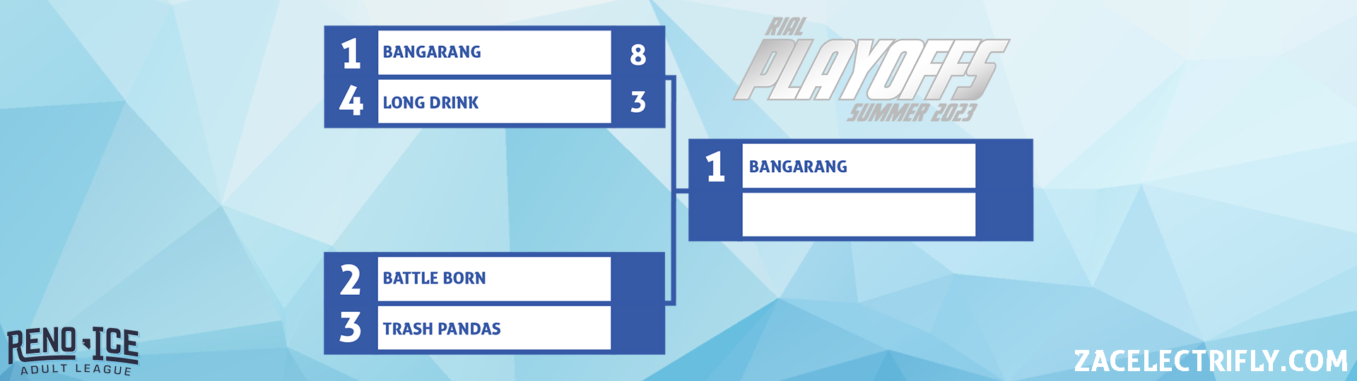 The Reno Ice Adult League Summer 2023 Playoffs started last night. The RIAL Summer 2023 Playoffs started with the E-League Semifinal games. The first E-League Semifinal game was between number one seed Bangarang and the number four seed Long Drink. The second E-League Semifinal game was played right after that. That game was between the number two seed Battle Born and the number three seed Trash Pandas. The RIAL Summer 2023 Playoffs will continue tonight with the B-League Semifinals. In the first B-League Semifinal the number one seed Carson City Hyundai will play the number four seed 4 Seasons. In the second B-League Semifinal game the number two seed Swift Institute will play the number three seed Cruz Construction.