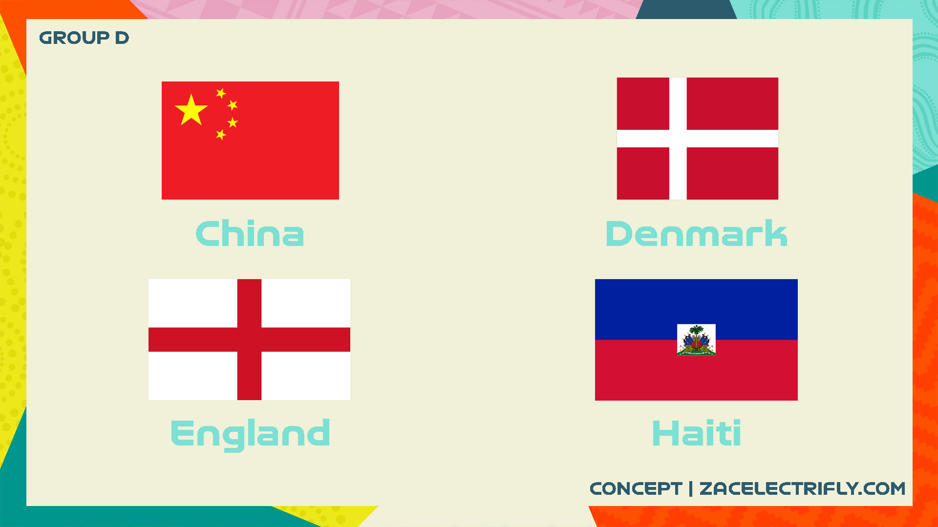 Here is what Group D looks like. The Denmark jerseys are my favorite. #1 ranked is Denmark. #2 ranked is China. #3 ranked is England. #4 ranked is Haiti.